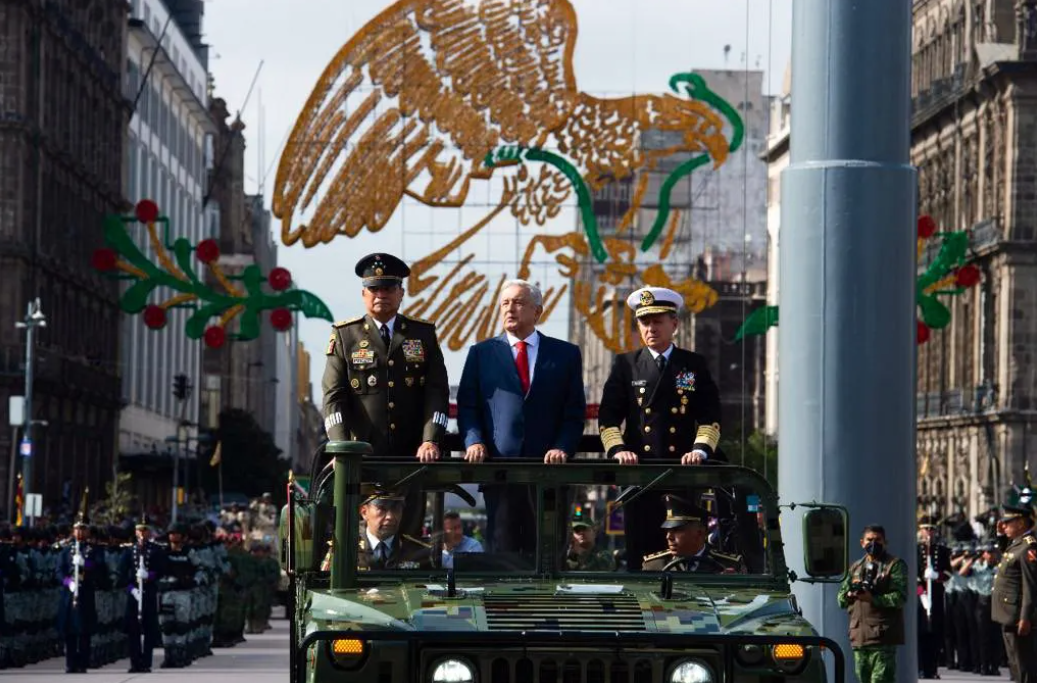 En punto de las 10:00 h y acompañado por los secretarios de la Defensa Nacional (Sedena), Luis Cresencio Sandoval, y Marina (Marina), José Rafael Ojeda Durán, el mandatario mexicano pasó revista a las contingente presentes en la plancha del Zócalo de la Ciudad de México.
