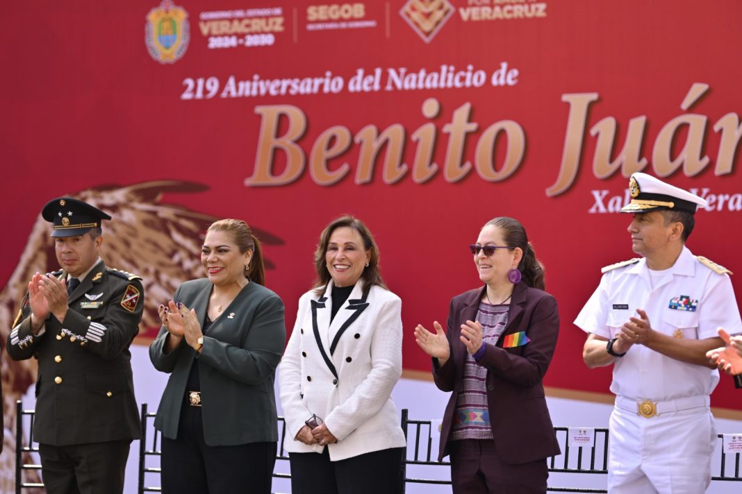 Xalapa, Ver., 21 de marzo de 2025.- La presidenta de la Mesa Directiva de la LXVII Legislatura, diputada Tanya Carola Viveros Cházaro, asistió a la ceremonia conmemorativa, guardia de honor y ofrenda floral con motivo del CCXIX aniversario del natalicio del Benemérito de las Américas, Benito Juárez, en el que estuvo al lado de la gobernadora de Veracruz, Rocío Nahle García; de la presidenta del Poder Judicial del estado, magistrada Lisbeth Aurelia Jiménez Aguirre, así como autoridades militares, navales, del gabinete estatal y municipales.