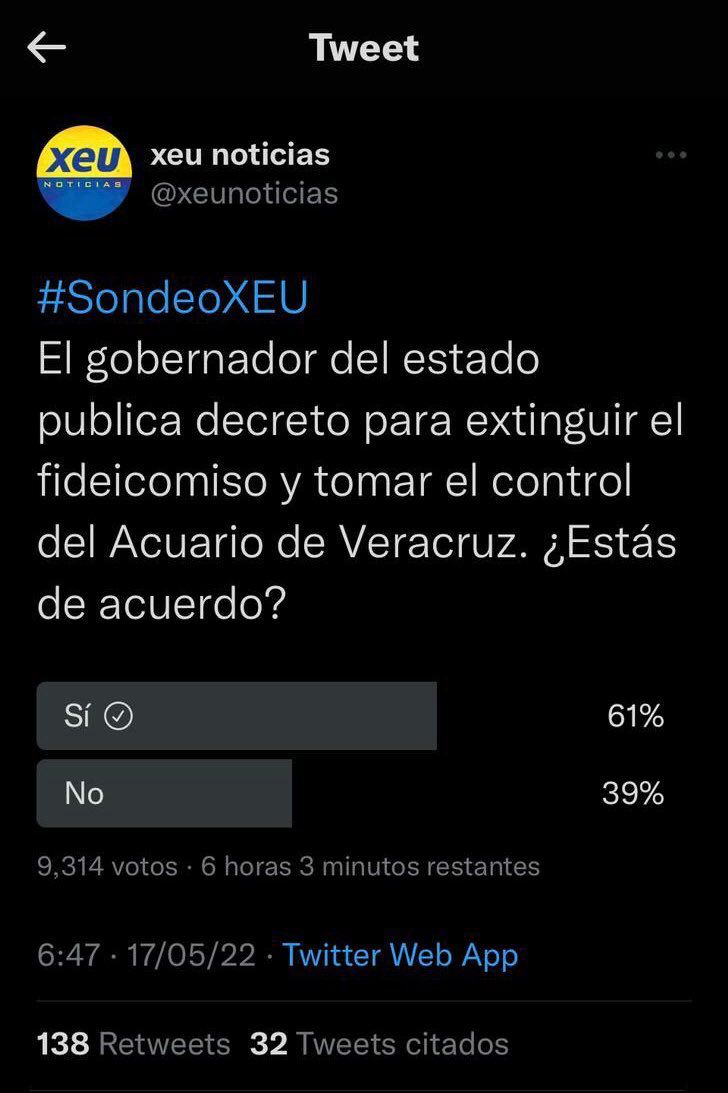 La familia Pazos, dueña del medio de comunicación XEU “La U de Veracruz”, preguntó en sus redes sociales: «El Gobernador del Estado publicó un decreto para extinguir el fideicomiso Y tomar el control del Acuario de Veracruz ¿Estás de acuerdo?