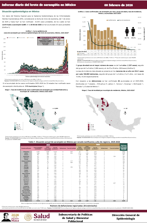 Según el reporte diario de la Secretaría de Salud federal, lo que va del brote de dicha enfermedad en la República Mexicana (2025-2026), se han confirmado un total de ocho mil 899 casos.