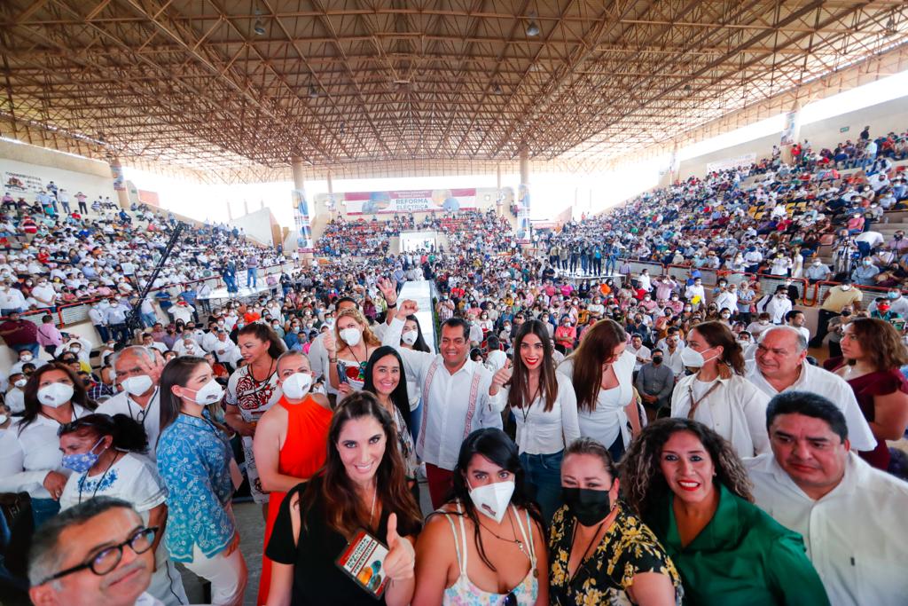Minatitlán, Ver., 6 de marzo de 2022.- Miles de personas están reunidas en el Centro de Convenciones de Minatitlán para iniciar la Asamblea Informativa Regional sobre la Reforma Eléctrica en la que participarán legisladores federales de MORENA, PT, PVEM y Fuerza Por México quienes están llegando al recinto con el anfitrión, el diputado federal minatitleco, Sergio Gutiérrez Luna.