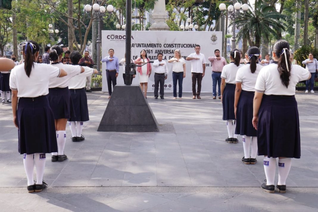Córdoba, Ver., (05 de mayo de 2023).- Este viernes, autoridades municipales encabezadas por el presidente municipal, Juan Martínez Flores, llevaron a cabo un acto cívico para conmemorar el 161 Aniversario de la Batalla de Puebla de 1862, a cargo de los alumnos de la escuela Centro de Estudios Superiores de Córdoba (C.E.S.C.O).