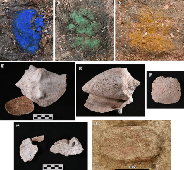 En el fondo de un pozo había un crucifijo más pequeño, donde encontraron pigmentos minerales —pequeños montones de tierra azul, verde y amarillenta— dispuestos de manera que se correspondían con los puntos cardinales.