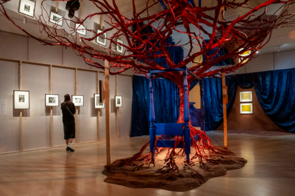 El museo sumerge al espectador en un teatro y lo guía al centro de la sala, donde un árbol rojo atraviesa una estrecha cama azul y extiende sus ramas sobre un espejo que cuelga del techo.