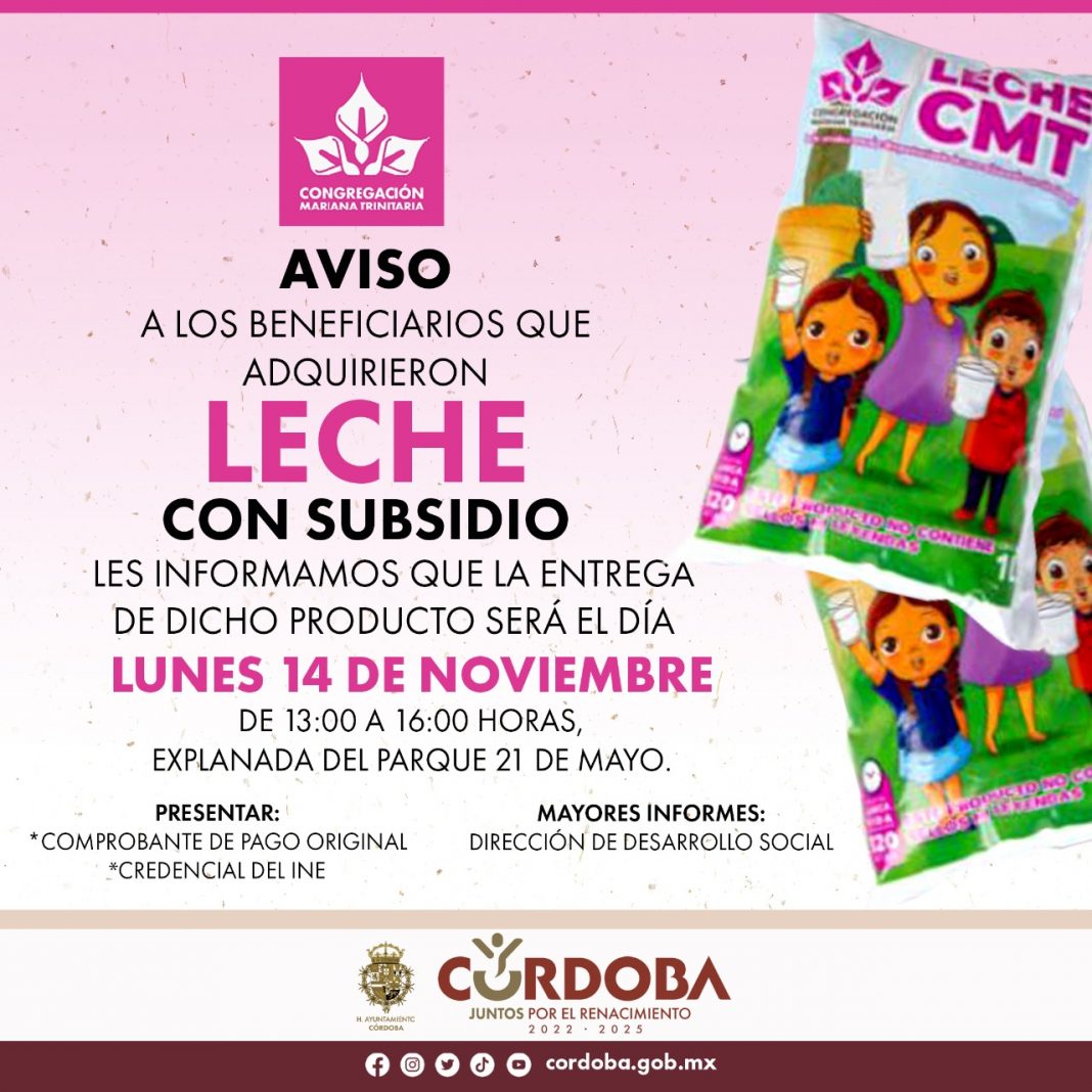 Córdoba, Ver., (08 de noviembre de 2022). – Mediante un trabajo coordinado entre la Dirección de Desarrollo Social y la Congregación Mariana Trinitaria, el próximo lunes 14 de noviembre, entregarán a mil cordobeses cajas de leche que adquirieron con subsidio, en apoyo a la economía familiar.