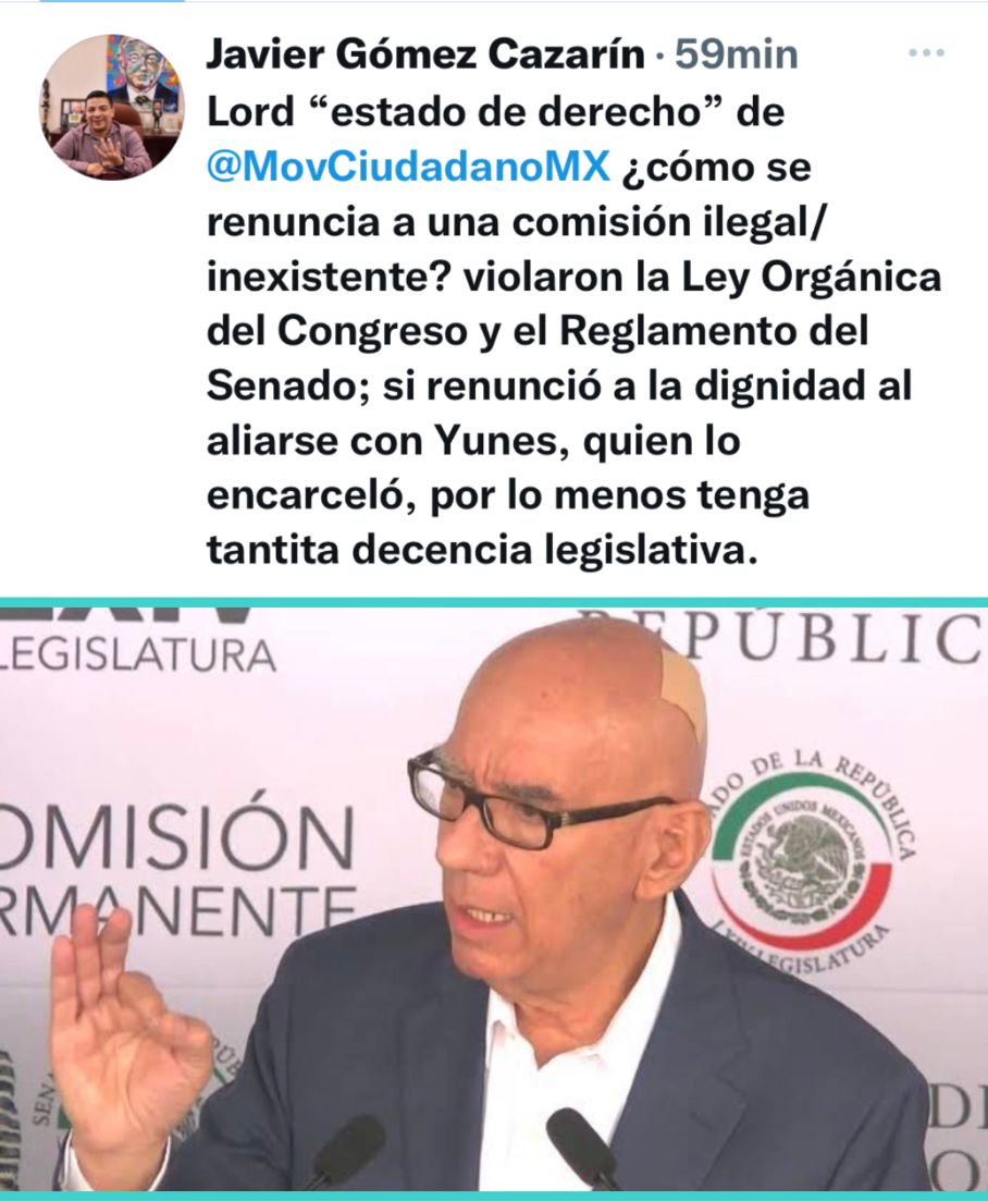 Gómez Cazarín se refirió a Dante como el “Lord Estado de Derecho”, por haber renunciado a una comisión ilegal o inexistente, y de haberse aliado con el ex gobernador de Veracruz, por 2 años, Miguel Ángel Yunes Linares, “quien lo encarceló” en el año de 1994.