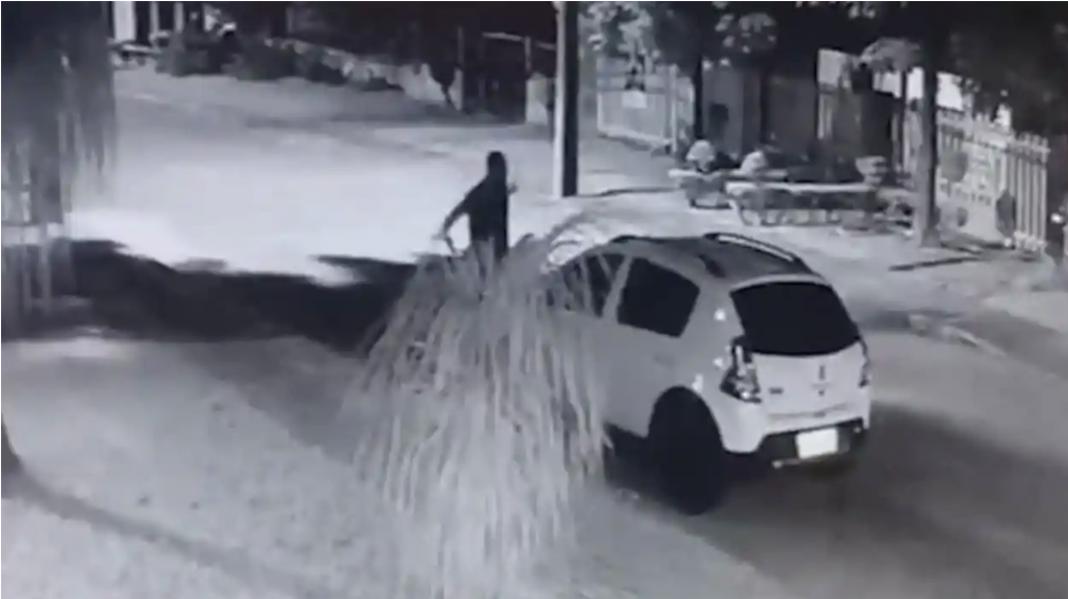Eduardo Alves, un personal trainer de 31 años de Jardim Roriz, en Brasilia, la capital de Brasil, fue captado en video mientras golpea el capote y las ventanas del vehículo, hasta que logró abrir unas de las puertas. El vagabundo bajó del carro y el esposo de la mujer corrió detrás de él.