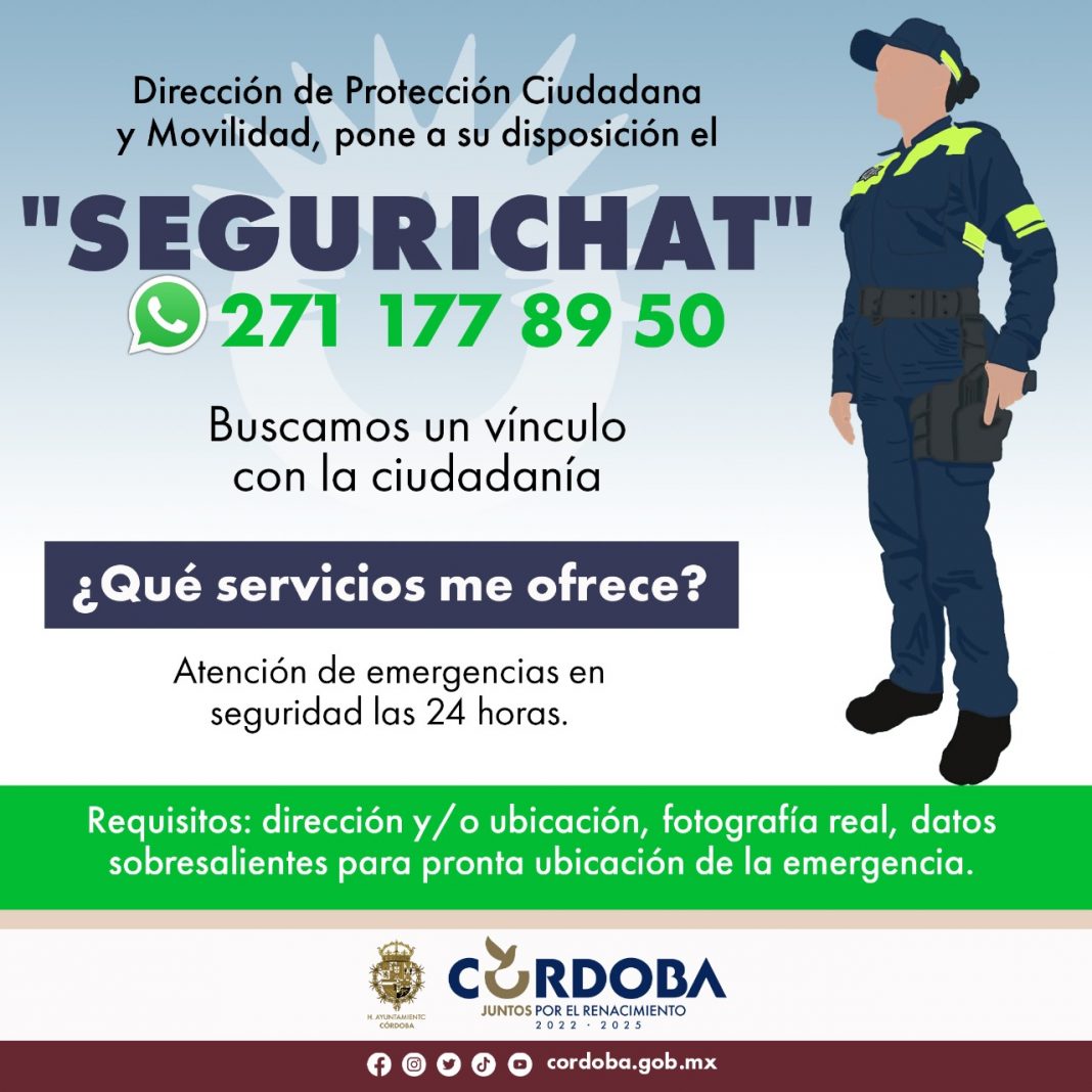 Córdoba, Ver., (08 de noviembre de 2022). – A fin de reforzar la seguridad de los cordobeses, la Dirección de Protección Ciudadana y Movilidad pone en marcha el programa: «Segurichat», en donde los ciudadanos podrán reportar a través de este número de WhatsApp 2711778950, temas de seguridad en tiempo real, a través de una fotografía y ubicación.
