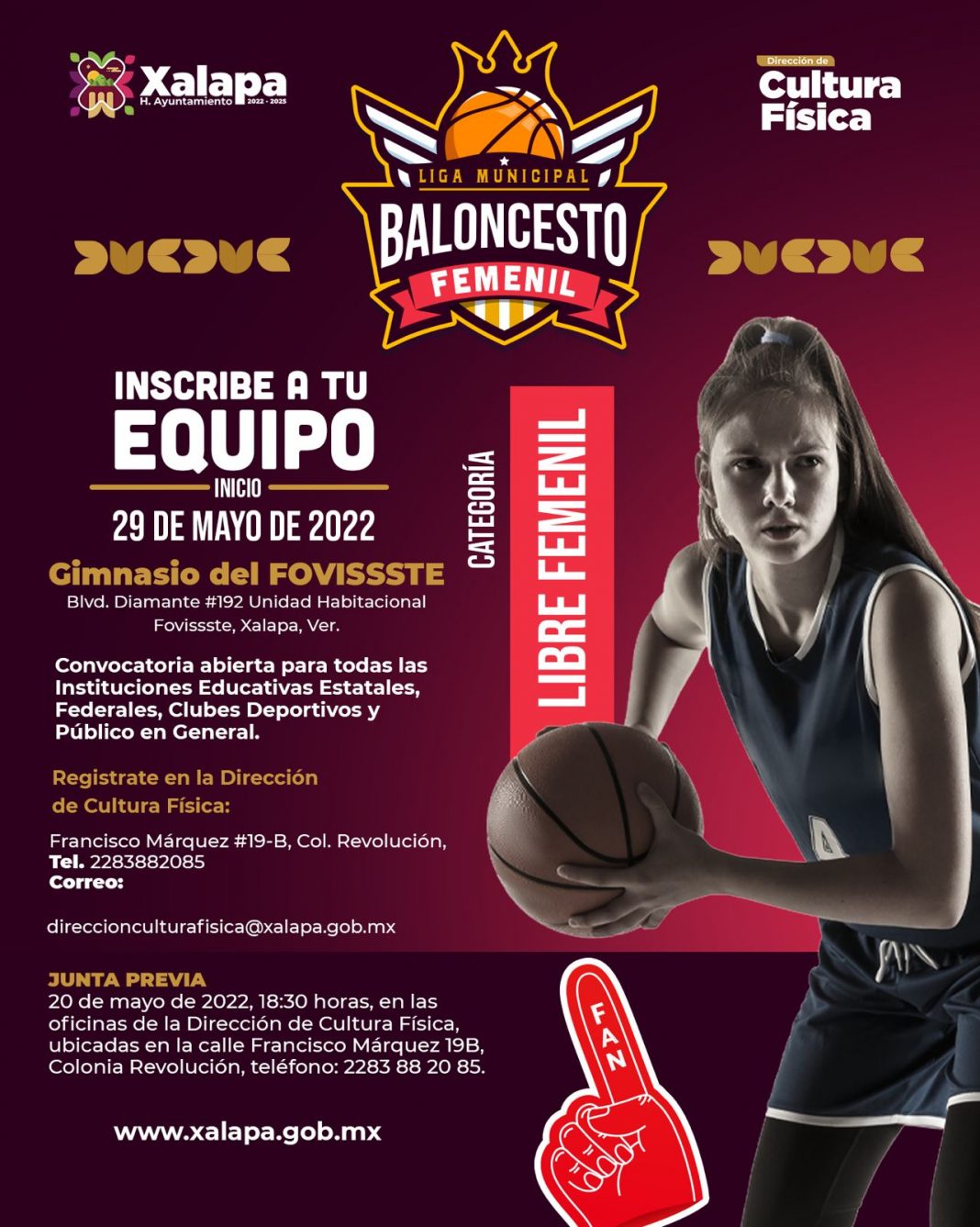 Xalapa, Ver.- Para fomentar la práctica del deporte en el municipio, la Dirección de Cultura Deportiva, a través del Comité Municipal del Deporte (Comude), invita a participar en la Liga de Baloncesto Categoría Femenil Libre en un torneo a desarrollarse el próximo 29 de mayo en las instalaciones del Gimnasio Fovissste.