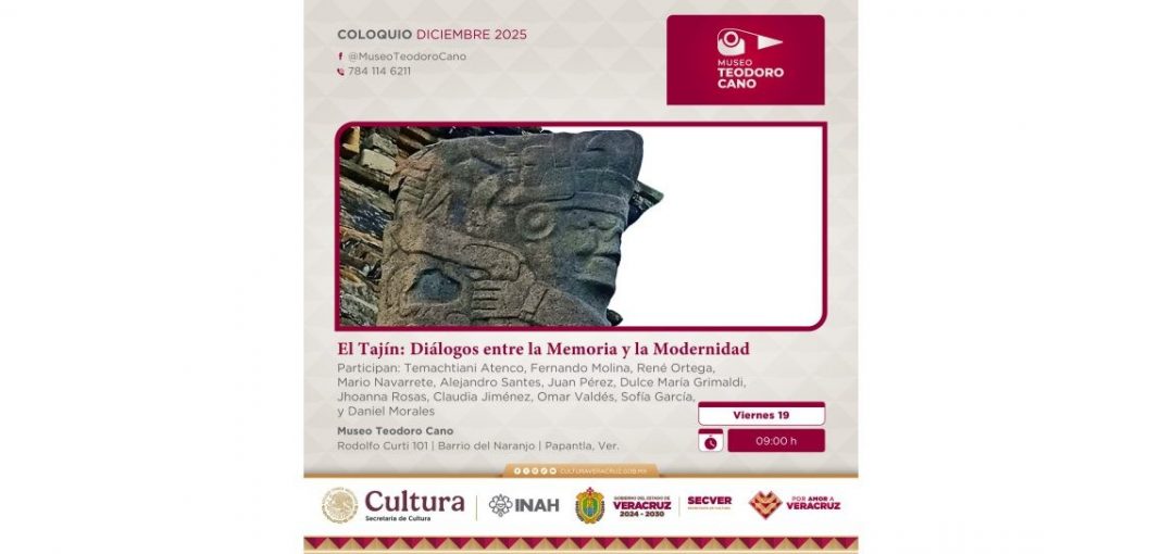 Xalapa, Ver.- La Secretaría de Cultura de Veracruz (SECVER) invita al público en general a asistir al coloquio El Tajín: Diálogos entre la Memoria y la Modernidad, el viernes 19 de diciembre a las 09:00 horas, en el Museo Teodoro Cano, ubicado en Papantla. La entrada es libre.