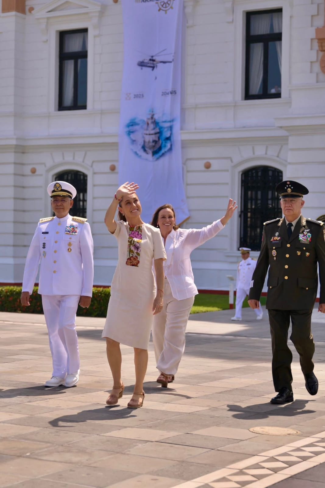 La Presidenta, en compañía de miembros de su Gabinete legal y ampliado, así como de los representantes del Poder Legislativo y Judicial, presenció el Desfile Conmemorativo de los 204 años del nacimiento de la Armada de México y los 201 años de la promulgación de la Constitución de 1824, en el que participaron 3 mil 871 efectivos de la Secretaría de Marina-Armada de México: mil 275 elementos mujeres y 2 mil 596 hombres; con 15 banderas de guerra, 10 estandartes, 41 guiones, ocho unidades de superficie, 24 unidades aeronavales, 24 embarcaciones menores, 70 vehículos operativos, 11 vehículos de apoyo con remolque, ocho camas temáticas, 38 caninos, ocho botargas y un Turibús con 25 niños.