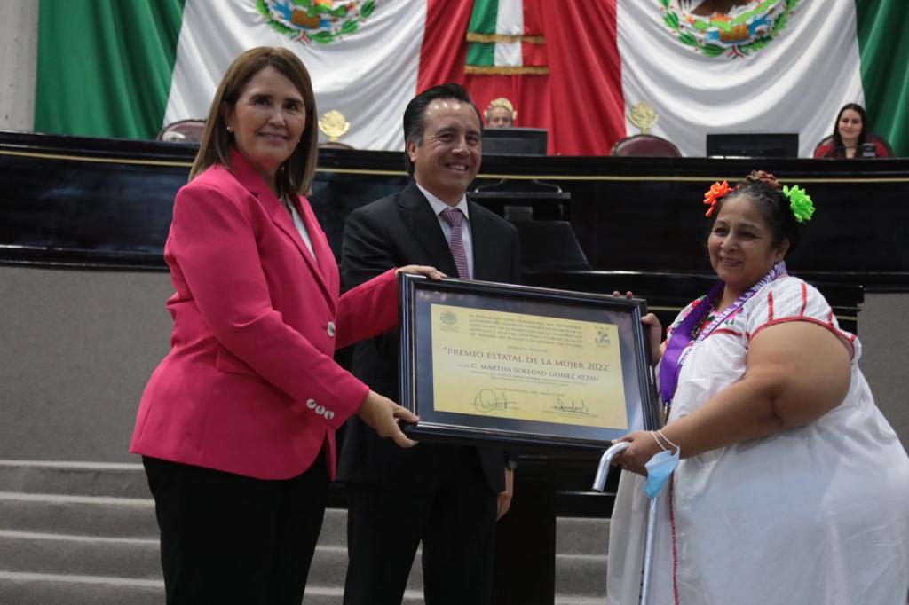Xalapa, Ver., 12 de abril de 2022.- El gobernador Cuitláhuac García Jiménez y el Congreso local entregaron el Premio Estatal de la Mujer a Martha Soledad Gómez Atzin, integrante y directora del colectivo Mujeres de Humo que ha dado un lugar relevante a la cocina tradicional totonaca ante los ojos del mundo.