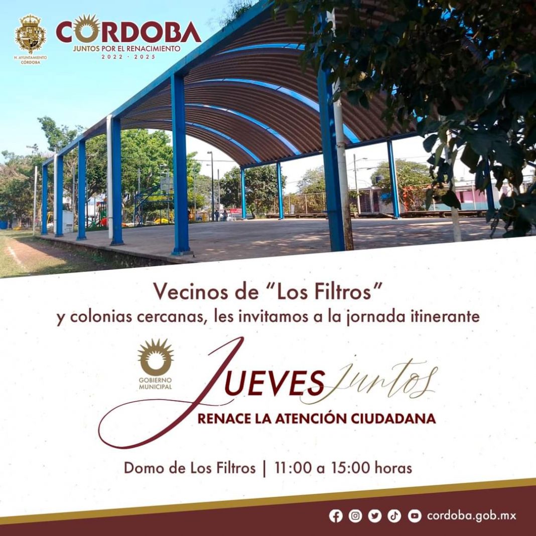 Córdoba, Ver., (26 de octubre de 2022). – Este jueves 27 de octubre, el Presidente Municipal, Juan Martínez Flores, en compañía de los Directores del Ayuntamiento acudirán al domo ubicado en Los Filtros como parte del programa de gobierno itinerante para atender las demandas ciudadanas de los vecinos de las colonias: México, Los Pinos, Araucarias, Las Brisas, Los Ciprés, Los Anturios, Filtros II, Valle de Córdoba, Cafetales y Villa Rica, a partir de las 11:00 horas.