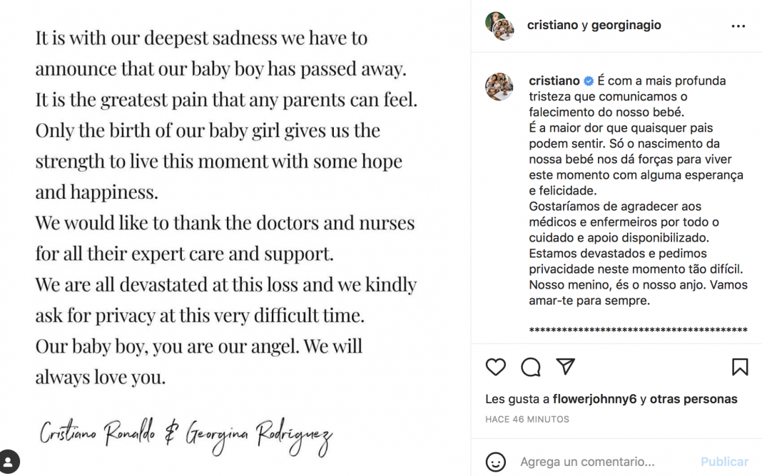 «Con nuestra más profunda tristeza tenemos que anunciar el fallecimiento de nuestro hijoEs el dolor más grande que unos padres pueden sentir. Solo el nacimiento de nuestra hija nos da la fuerza para vivir este momento con algo de esperanza y felicidad. Queremos agradecer a los doctores y enfermeras por su cuidado y apoyo. Estamos devastados por esta pérdida y rogamos privacidad en este duro momento. Bebé, eres nuestro ángel. Siempre te amaremosCristiano Ronaldo y Georgina Rodríguez», publicó el astro.