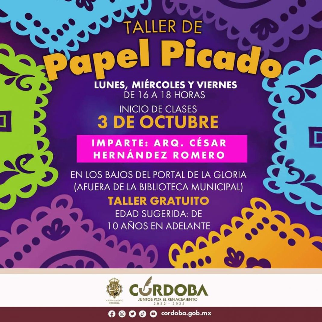 Córdoba, Ver., (01 de octubre de 2022).-El Ayuntamiento de Córdoba, a través de la Coordinación de Cultura, invita a la población al taller de «Papel Picado», que se realizará de manera gratuita durante todo el mes, iniciando este lunes 3 de octubre.