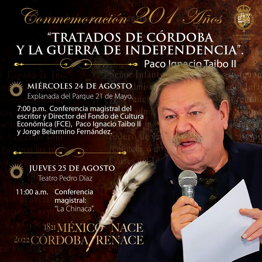 Córdoba, Ver., (16 de agosto de 2022).- El Director del Fondo de Cultura Económica (FCE) y escritor, Paco Ignacio Taibo II ofrecerá en Córdoba las conferencias magistrales: “Tratados de Córdoba y la Guerra de Independencia” y “La Chinaca”, en el marco del Programa Cívico y Cultural por la conmemoración de los 201 años de la firma de los Tratados de Córdoba.