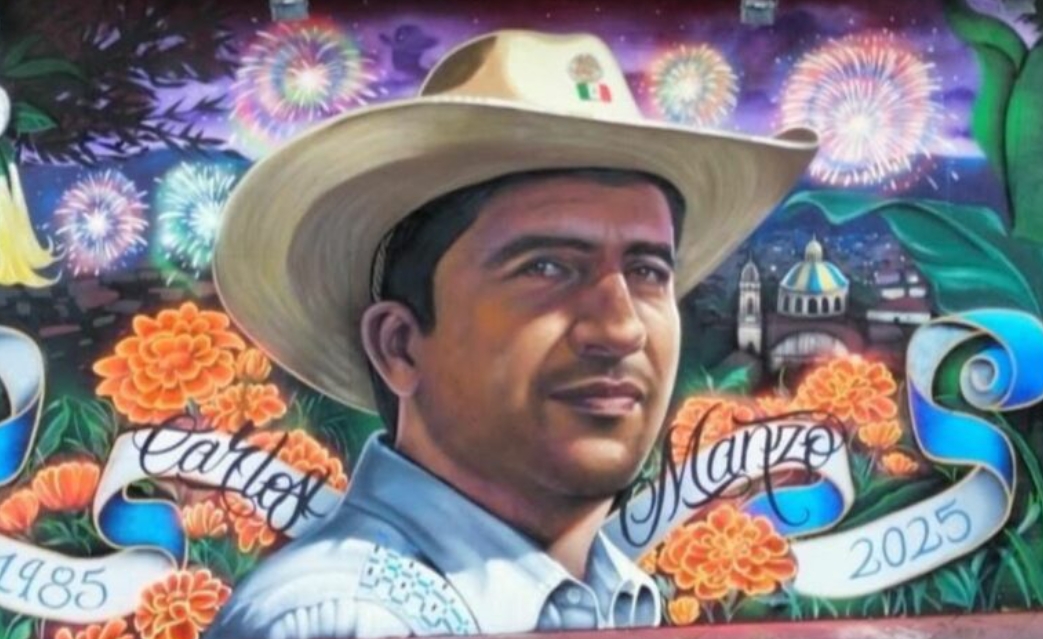 El mural retrata a Carlos Manzo portando un sombrero con la bandera de México y el escudo nacional en grande, con paisajes de Uruapan, fuegos artificiales, flores y una mariposa detrás.