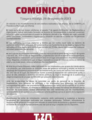 De acuerdo con el Ayuntamiento de Tizayuca se notificaron citatorios y medios al dueño del puesto, y para el día 12 de agosto se le informó que contaba con 10 días hábiles para suspender cualquier actividad comercial y de servicios.