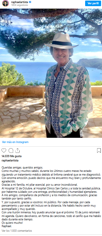 “(Gracias) a toda la sanidad pública, por haberme cuidado con una entrega, profesionalidad y humanidad ejemplares”, añade Raphael., que ha agradecido a los hospitales donde ha sido atendido.