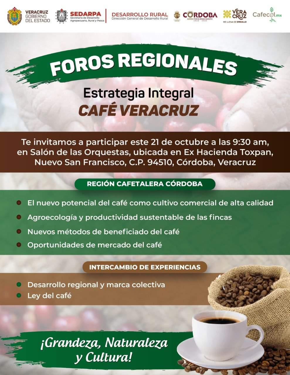 Córdoba, Ver., (15 de octubre de 2022). – A fin de impulsar la competitividad de la cafeticultura en 13 municipios de la región, el próximo 21 de octubre, la Dirección de Desarrollo Económico a través de la Jefatura de Fomento Agropecuario en Coordinación con la Dirección General de Desarrollo Agropecuario, Rural y Pesca (Sedarpa) y Cafecol, realizarán el «Foro del Café» en las instalaciones de la Ex Hacienda Toxpan.