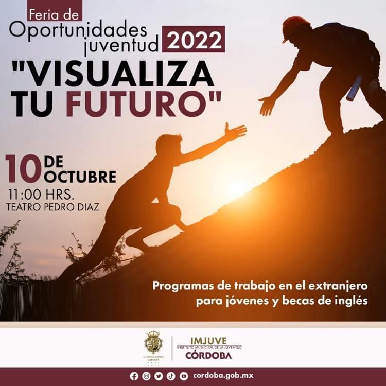 Córdoba, Ver., (09 de octubre de 2022). – Con el objetivo de impulsar a la juventud cordobesa para ampliar sus horizontes y oportunidades, el Instituto Municipal de la Juventud llevará a cabo este lunes, la segunda edición de la feria denominada “Visualiza tu Futuro”, en la cual, darán a conocer jóvenes de 18 a 29 años, programas para trabajar en el extranjero, así como becas del 50 y 100 por ciento para cursos de inglés.