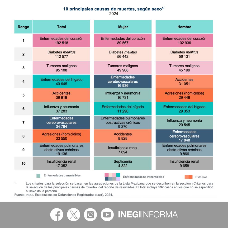 También resaltó que los accidentes fueron la quinta causa de muerte, con 39 mil 919 registrados, mientras que los homicidios fueron la octava causa de muerte, con 33 mil 550, un poco más de los 32 mil 252 que se registraron en 2023.