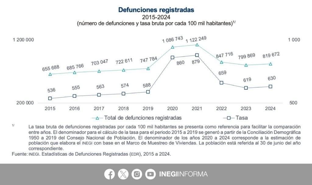 El dato de 2024 se compara con los poco más de 1.12 millones de fallecimientos reportados en 2021 y los más de 1.08 millones en 2020, los años con el mayor número de muertes en la historia de México en medio de la pandemia de covid-19.