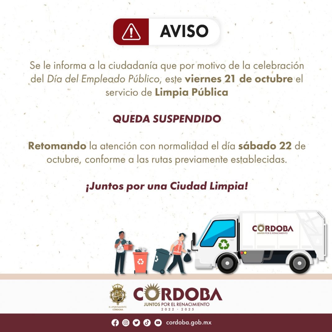 Córdoba, Ver.- Respetando los derechos laborales de los trabajadores, el servicio de Limpia Pública suspenderá sus actividades este viernes 21 de octubre, retomando sus actividades de manera normal el día sábado 22 de octubre.