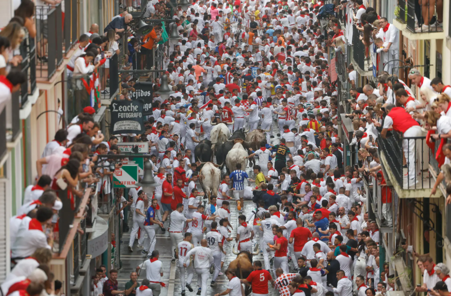 El primer encierro de toros de lidia de los sanfermines, considerada la fiesta española más internacional, fue muy rápido y también accidentado por las frecuentes caídas de animales y corredores sobre un pavimento mojado por la lluvia de las horas previas.