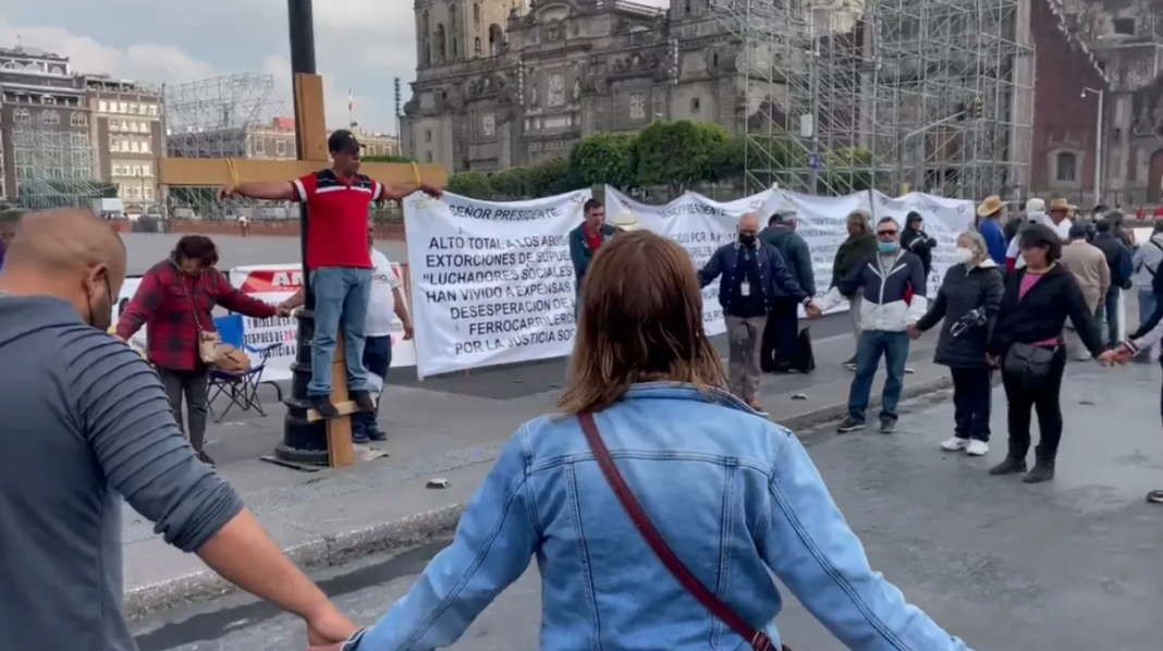 Y mientras el presidente López Obrador en la 'mañanera', pensionados y jubilados ferrocarrileros se 'crucificaron' frente a Palacio Nacional para exigir el resarcimiento al daño causado por la privatización